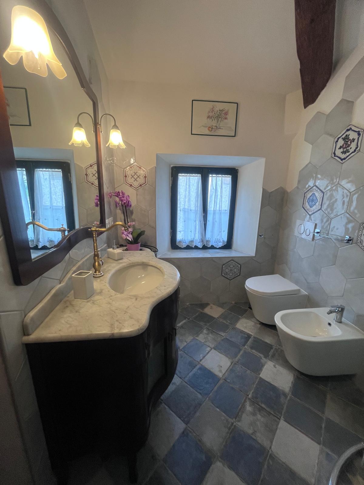 Il bagno, ampio e finestrato, è un’ulteriore carezza per i vostri sensi, con una spaziosa doccia e un’elegante trave a vista che sottolinea il carattere unico.