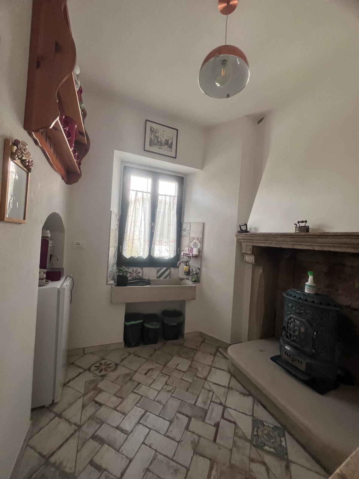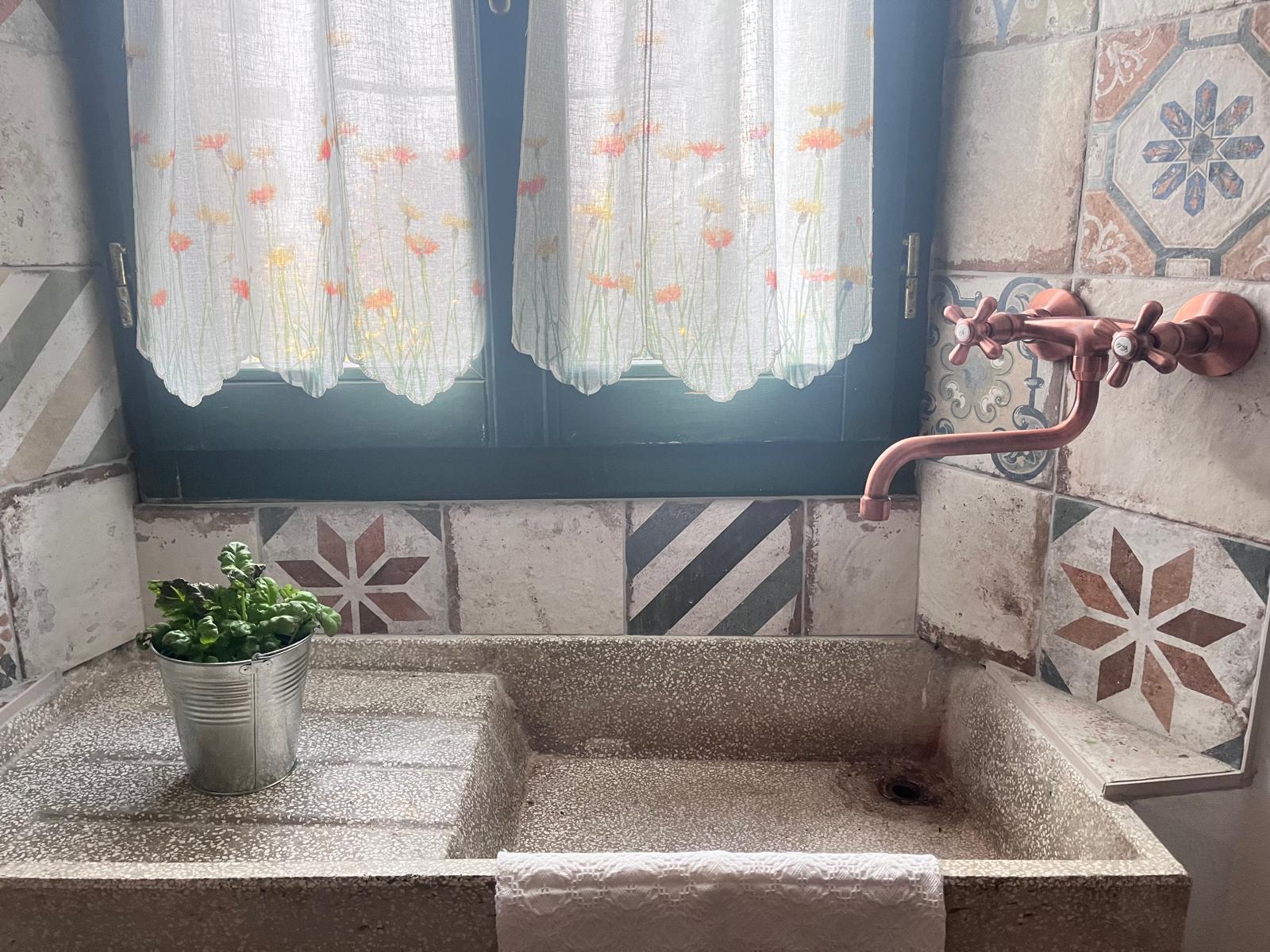 La cucina è un angolo che custodisce gelosamente un antico camino e un lavandino in sasso, evocando la convivialità di tempi lontani.